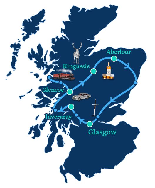 Includes 7 nights hotel, Loch Lomond Boat Tour, Hogwarts Steam Train, and Macallan Distillery Tour and Tasting.